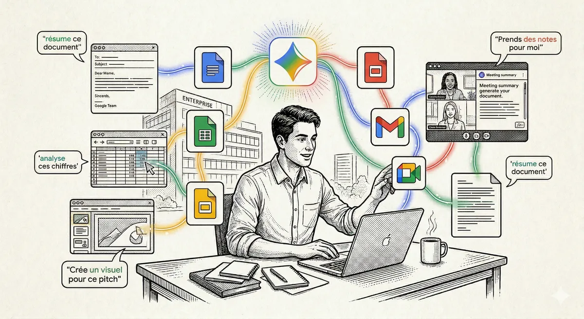 Concrètement, au lieu de naviguer entre plusieurs outils pour trouver une information, vous posez une question en langage naturel et obtenez une réponse sourcée, contextualisée par les données de votre organisation. Gemini Enterprise peut aussi générer des images, des rapports, et assister sur des tâches administratives.